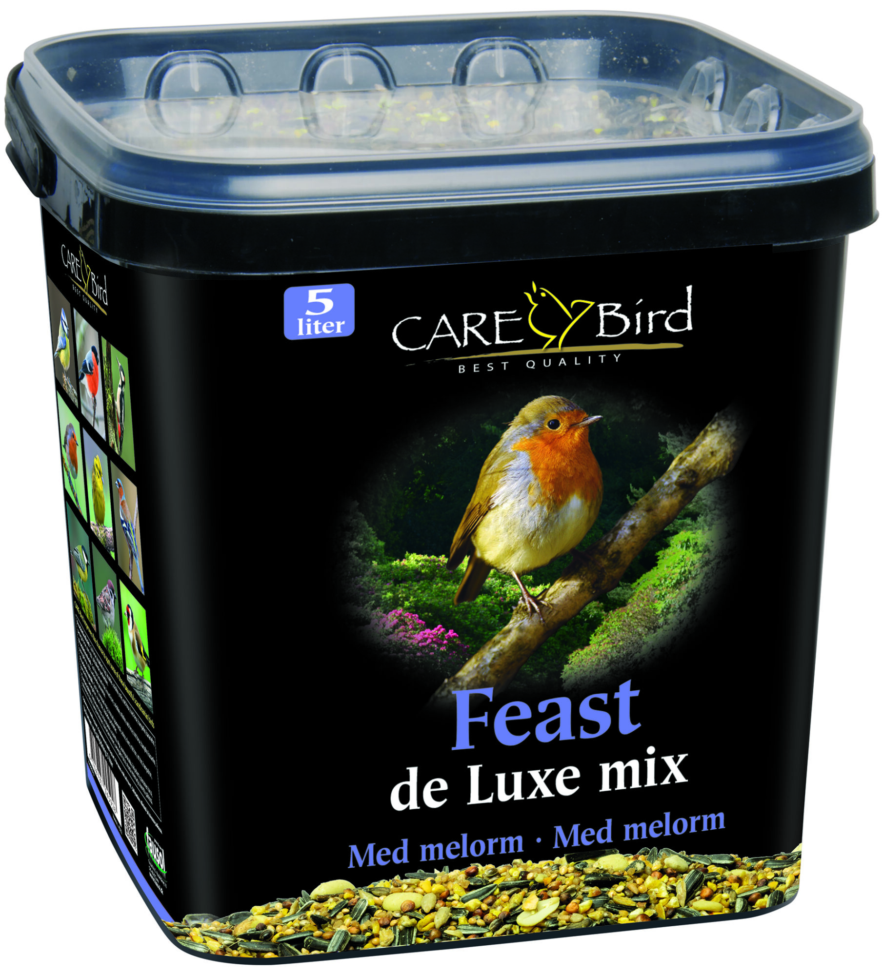 Fuglefoder bestående af højenergi frø tilsat tørrede melorme, for ekstra høj næringsværdi. En proteinrig blanding der tiltrækker selv de mindst fugle i haven. Feast De Luxe er en eksklusiv fuglefoderblanding fyldt med nærende ingredienser der udover melorm også indeholder jordnødder/peanuts, rød dari og flere andre energirige frøtyper. Denne premium fuglefoderblanding er håndlavet i Danmark af Care-Bird. Care-Bird er udover forskellige varianter fuglefoder også velkendte for at fremstille robuste og flotte fulgefoderautomater og lignende.