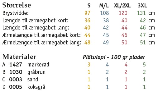 14 m og 19 pinde med 2 tråde pladegarn og glatstrik på pind nr 5½ = 10 x 10 cm.