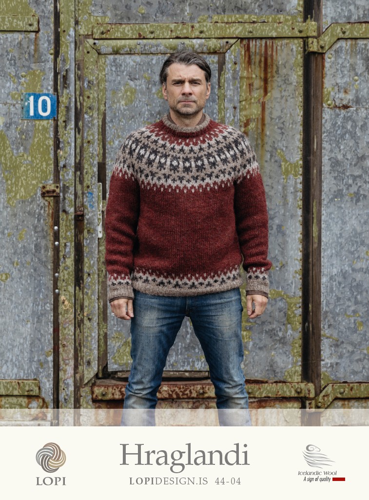 Virkelig skøn Islandsk sweater “Hraglandi”. Denne lækre og flotte sweater er strikket i den uspundne pladegarn Plötulopi. Strik den perfekte sweater til vinterens kolde dage. Designeren Védís Jónsdóttir beskriver designet som “Kraftige snebyger – hård vind og snevejr nu fyger det i fjeldene.”