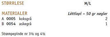 18 masker og 24 pinde glatstrik på pind nr 4½ = 10 x 10 cm. Hvis vanterne skal være tættere og mindre kan de strikkes på pind nr 4.